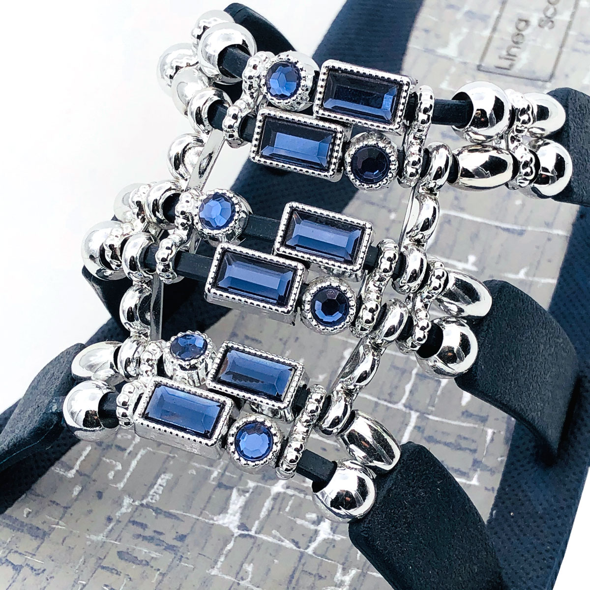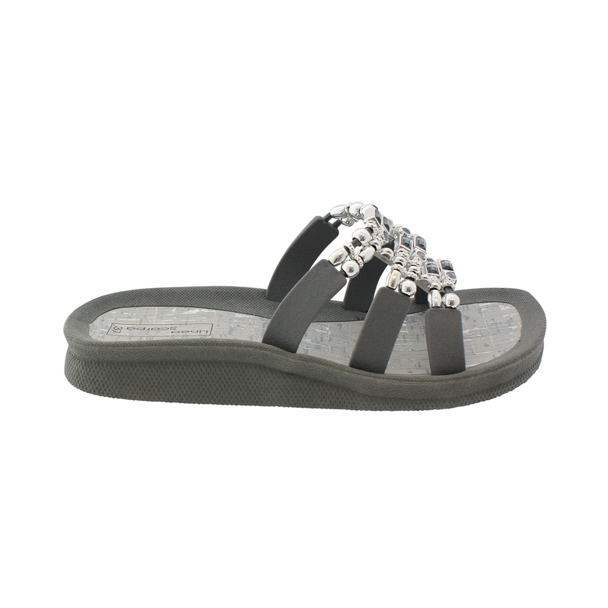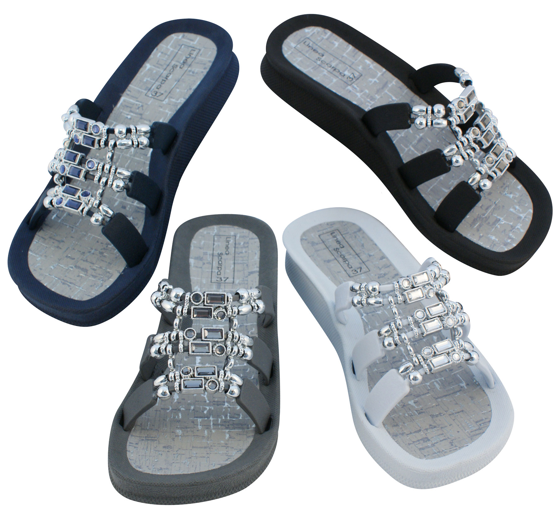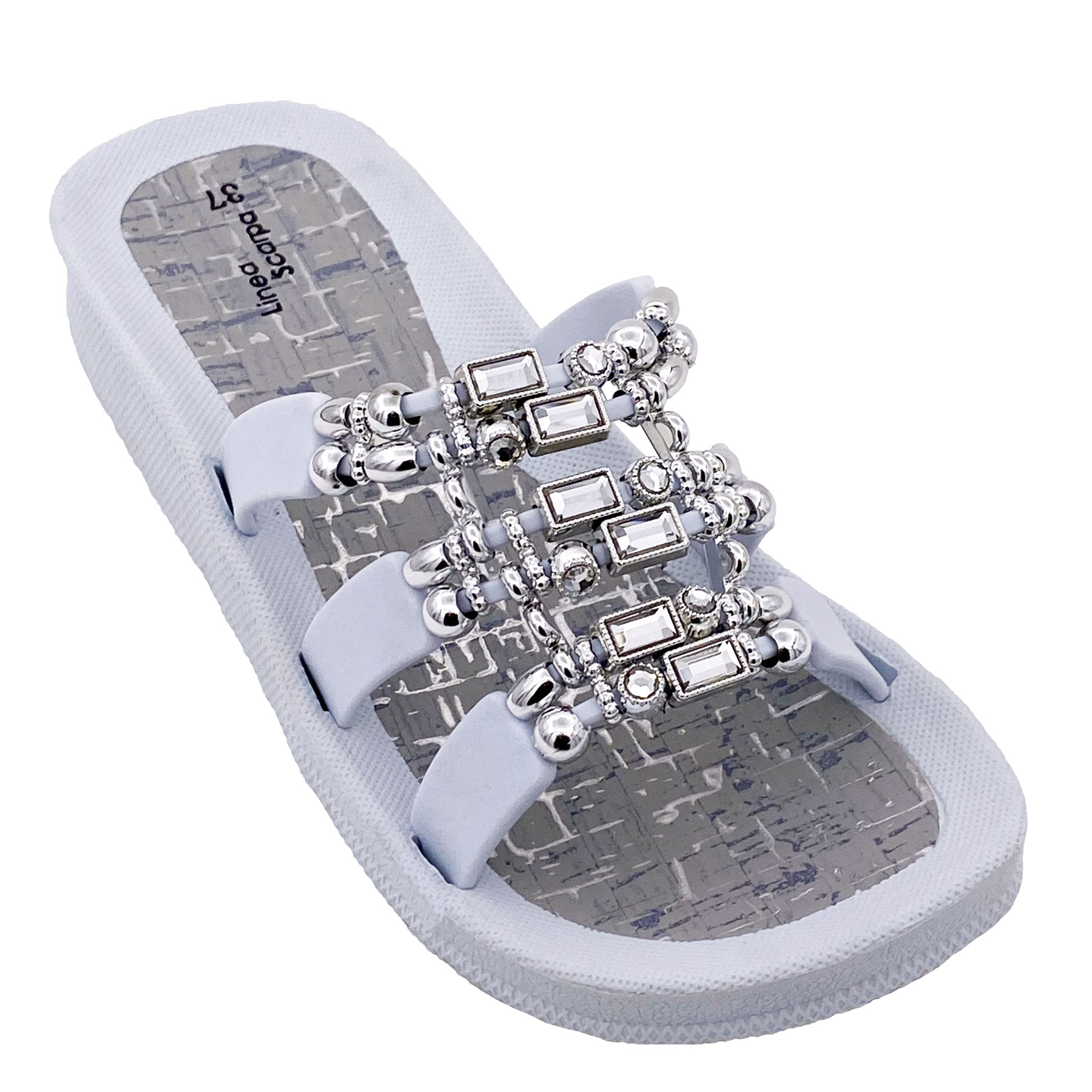Das Oberteil besteht aus drei durch die Dekorelemente verbundenen Riemchen und bietet daher guten Halt - eine gute Passform - auch für "Nichtmodellfüße".