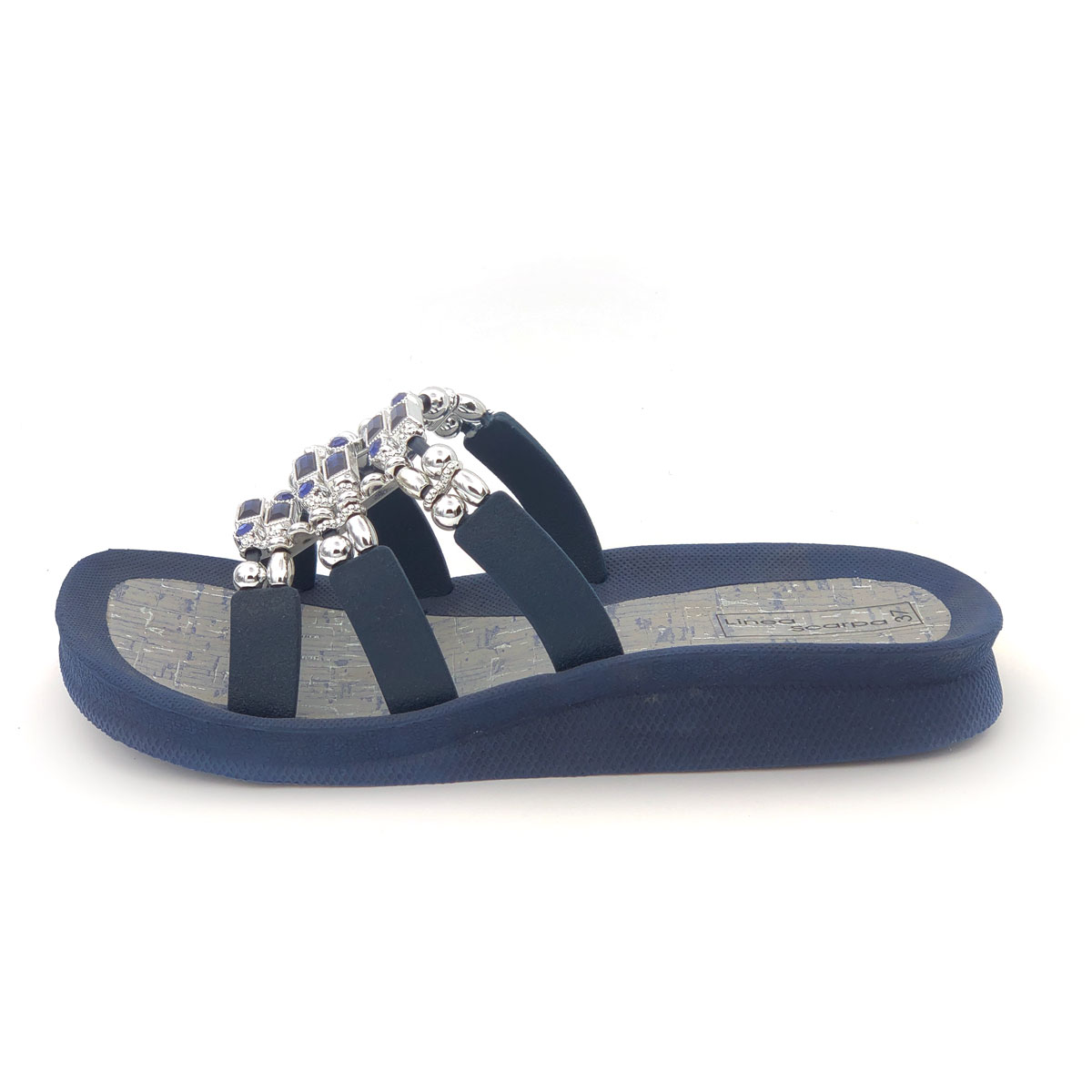 Während die Sohle und ein Großteil des Oberteils in navy, grau oder schwarz uni gehalten sind, besteht das Dekor des Obterteils aus farblich passenden Dekorsteinen in in Glasoptik und und silberfarbenen Perlen. Daher lassen sich diese unifarbenen Badeschuhe gut zu Bademoden und modischen Strandoutfits kombinieren.